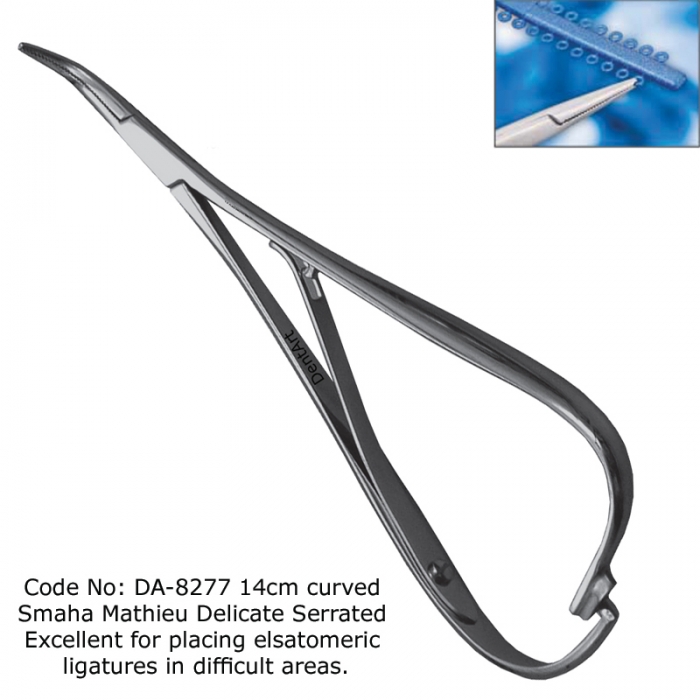DA-8277 14cm curved Smaha Mathieu Delicate Serrated Excellent for placing elsatomeric ligatures in difficult areas.